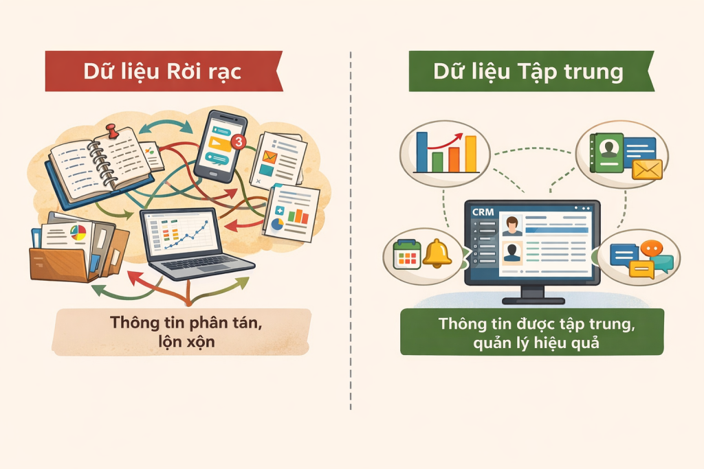 Thông tin khách hàng thường nằm rải rác ở nhiều kênh khác nhau như Facebook, Zalo, email hoặc file Excel. Mỗi bộ phận giữ một phần thông tin, nhưng không có hệ thống nào kết nối lại với nhau.